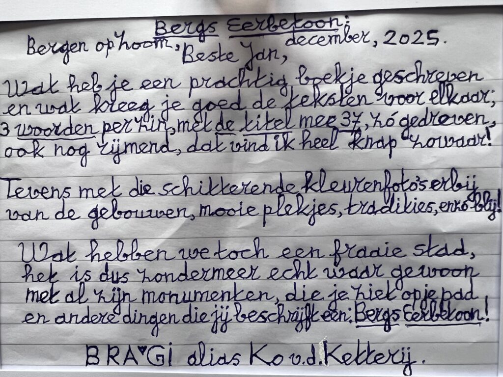 Het boek “BERGS EERBETOON” is de 62e uitgave van de woordspeler. Deze publicatie bevat 37 onderwerpen uit Bergen op Zoom, die steeds met 37 woorden, op rijm, zijn belicht. Het eerbetoon gaat onder meer over Anton van Duinkerken, erevelden, geit, Grote Markt, Jacob Obrecht, kaai, Kraaijenberg, Lievevrouwepoort, Lourdesgrot, Markiezenhof, Ommegang, Peperbus, Ravelijn, reuzen, Sinterklaas, stadhuis en Wana.